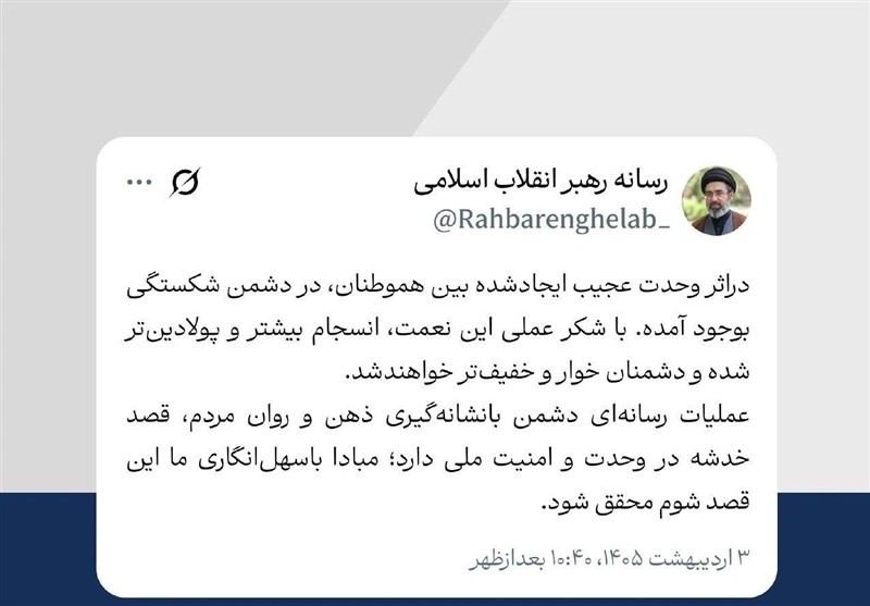 Ayətullah Seyid Müctəba Xamenei qeyd edib ki, bu birliyin qorunması və daha da gücləndirilməsi mühüm əhəmiyyət daşıyır. O vurğulayıb ki, mövcud həmrəylik davam etdirilərsə, düşmən qüvvələr daha da zəifləyəcək.